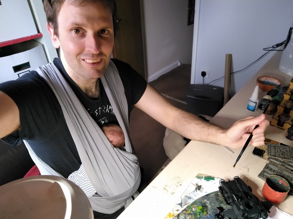 Wrapping the baby up in a sling has been a game changer. Not only is she nice and cosy while she snoozes, it also frees my arms enough to pick up a brush. Detail work isn’t recommended as they can be wriggly little things, but washing, base coating, drybrushing, and contrast paint work is all perfectly feasible. If you do try a sling, keep your eye on the baby’s temperature and breathing, as it can get hot in there, and don’t keep them there too long.
