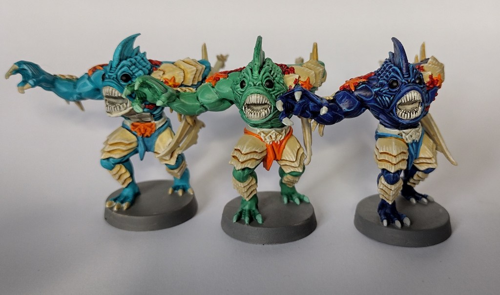 The fish monsters which replace the old fimirs as wandering monsters feel a touch out of place (perhaps they’d be better in a themed expansion) but they offered a different painting challenge with all the coral and starfish and the like covering them. It was these reef-like flourishes that led me to choose a brighter, more pastel style palette rather than the drab colours of the angler fish they seem based on. It’s on these minis where you see the drawback of the type of plastic used – those spears/axes are prone to bending.