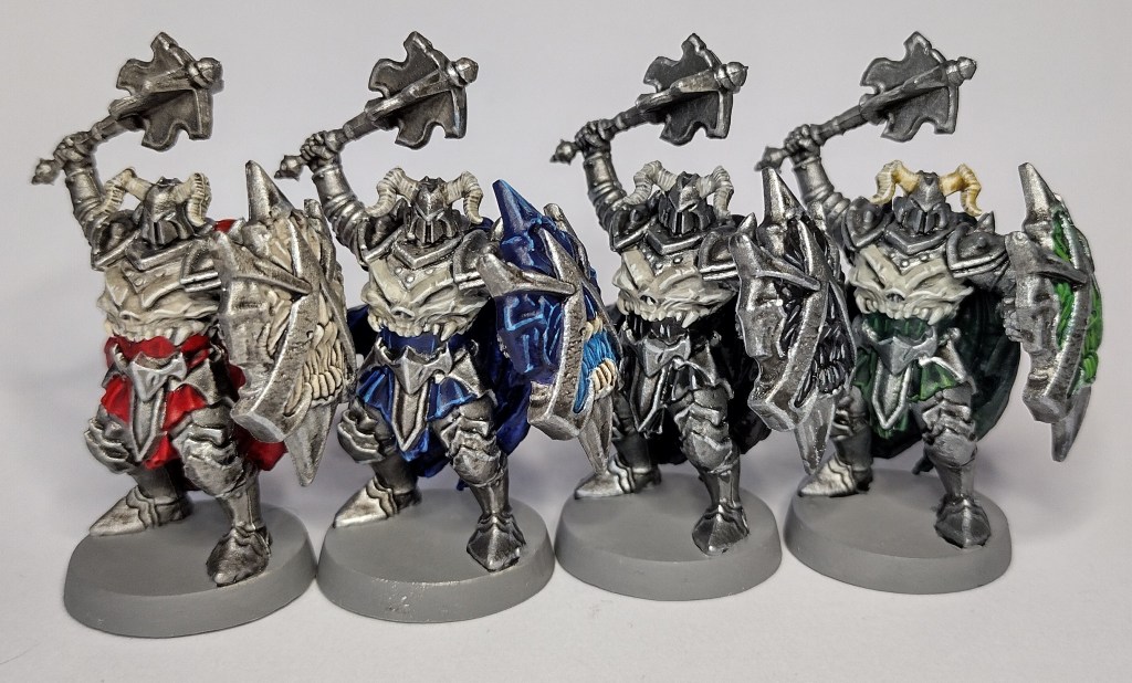 When sets have repeated sculpts, I like to have a way of differentiating them. Variety always helps keep the painting fresh and it helps a little on the table when a player can point to the ‘orc in blue’ rather than, ‘That orc. The one over there by the grey thing.’ I painted select parts of each repeated sculpt with a different colour which might also suggest different factions or tribes within the minions of the dungeon, adding a hint of extra narrative.