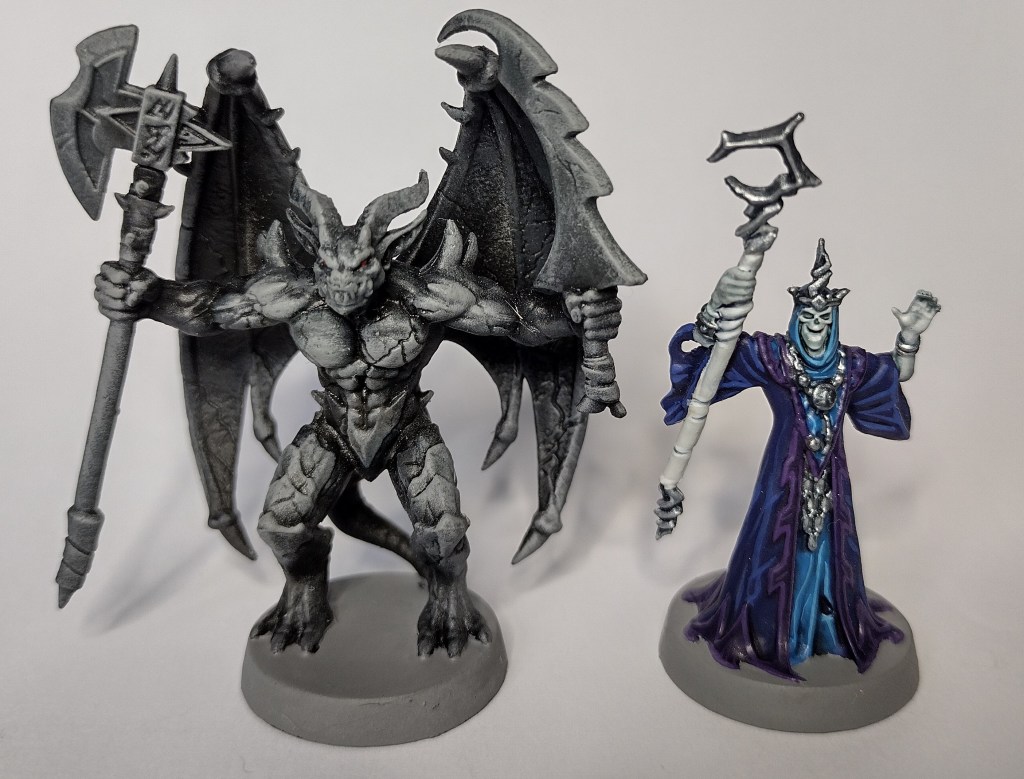 And what’s a dungeon crawler without villains? These are particularly good reimaginings of the original. Since gargoyles are supposedly just stone, this was the quickest to paint, if a little uninspired on my part. It’s just GW black primer, followed by successive drybrushed layers of Vallejo German Grey, Vallejo Dark Sea Grey, and GW Ulthuan Grey. The eyes were picked out in GW Mephiston Red. I do, however, like the idea of one of the heroes walking past a seemingly stone statue and its eyes lighting up, perhaps a growl escaping its rocky lips.