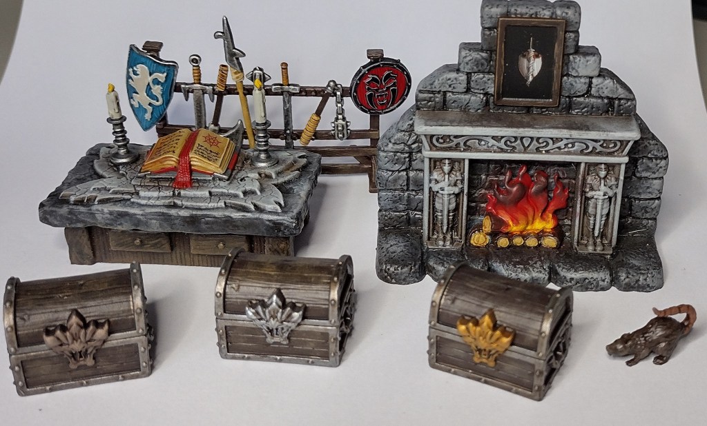 Being fully plastic, the furniture is a significant improvement over the original and is a whole lot more robust. While my old card treasure chests got squashed and frayed, these feel like they can handle the wear of regular play, provided they’re well varnished after painting. One handy trick I used on the furniture was to raid the Forge World Dark Angels transfer sheet and used a couple on the framed picture and spell book.