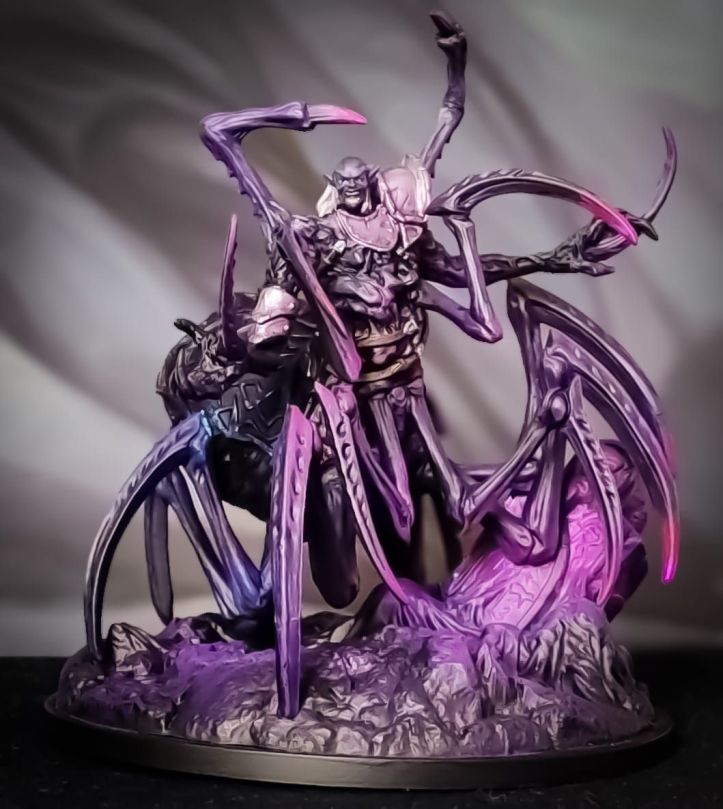 I’d taken some inspiration from some Tyranids I’d seen on Pinterest which were sporting some mind blowing glow effects. Since driders are creatures of the Underdark, I figured that OSL (Object Source Lighting) was the way to go. I’d intended to use some 3D printed mushrooms as light sources until I noticed the cracks in the sarcophagus on the base and thought there could be some pretty tasty magic blasting out of that thing.