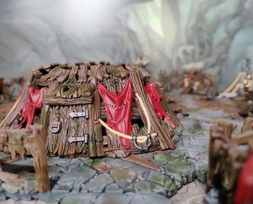 The details also got a quick and easy job. Ropes, bones and strings got a base coat of white, followed by a single layer of GW Skeleton Horde Contrast. Metals are just Vallejo Gunmetal Grey washed with GW Agrax Earthshade. Fabrics are a base coat of GW Mephiston Red washed with GW Carroburg Crimson. Normally I’d go in for some layered or drybrushed highlights but since this is a goblin lair where things are a bit dingy, I felt it would look more appropriate with a dirtier, duller look.